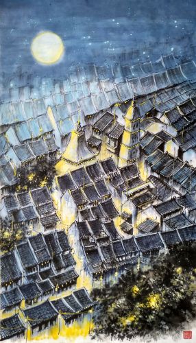 以鸟瞰的视觉角度,传统的笔墨,写实的客观环境,看中式建筑风格镶嵌在南洋回教清真寺的实体上,在古月照今尘的趟越时空中,记录描绘古城历尽沧桑的岁月;以韵律节奏感,和空间感相给合,转化为古城意蕴深远的历史情怀。
