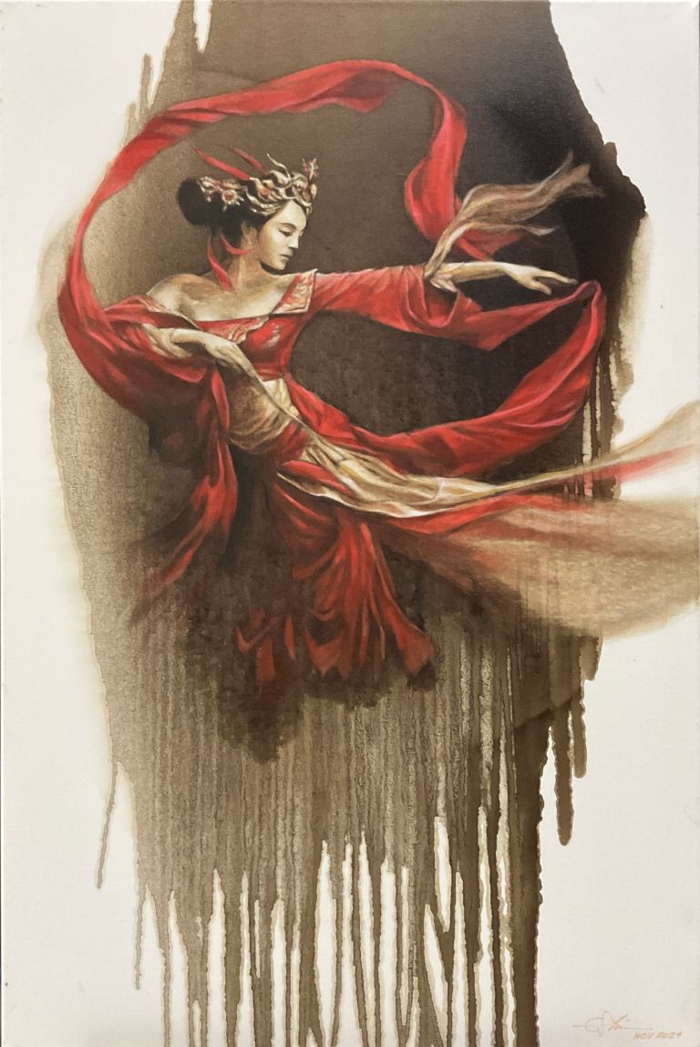 林荣祥 马来西亚 亚洲美术家协会会员 林荣祥,曾在广告创意领域耕耘数十年,最终回归初心——艺术。他的创作并不满足于单纯的写实,而是通过符号、肌理与多样化的表现手法融入抽象元素。当熟悉的形象被赋予全新的视角,或当质朴的原始感与明快鲜活的色彩交织时,便形成了写实与抽象的独特融合。他始终致力于探索这种张力与平衡,创作出兼具个性与深度的艺术作品。 《飘渺》 丙烯和沥青 / 61cm x 92cm 创作年代: 2024