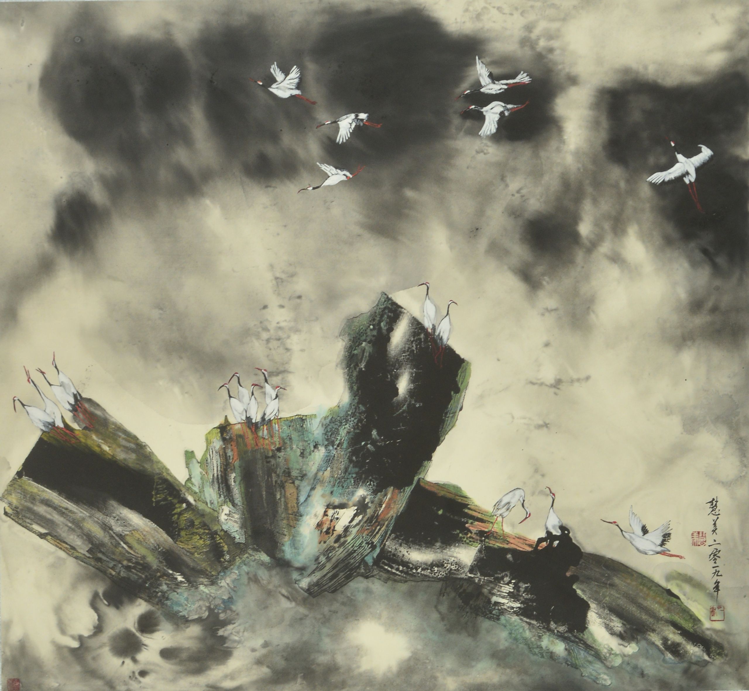 甘慧美 马来西亚 亚洲美术家协会会员 甘慧美,活跃于国际舞台的水墨画家,现任中国文化中心导师。多年来积极参与各类艺术展览,涵盖个展、联展及慈善展,足迹遍及韩国、中国、澳大利亚、台湾及新加坡。其作品曾多次被国内外报刊、杂志及中国电视台报道,广受艺术界与媒体关注。她擅长以水墨表现自然意象,尤爱描绘仙鹤之姿,笔触高雅,寓意深远。 《欢聚一堂》 水墨设色 / 130cm x 120cm 创作年代: 2020获邀2024年“逐梦深蓝·青岛国际名家邀请展”